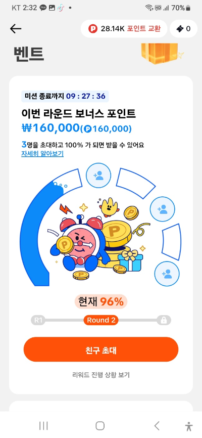 친구 초대하고 현금 보상 받기 틱톡라이트의 친구 초대 이벤트는 사용자들에게 더 큰 혜택을 제공합니다. 신규 사용자를 초대할 때마다 상당한 금액의 현금 보상을 받을 수 있는데요, 한 명을 초대할 때마다 양쪽 모두 2만 원씩 받을 수 있어요.